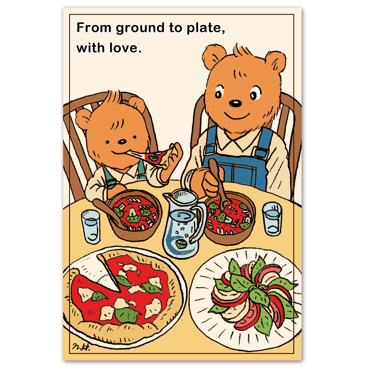 夏開催だったため、夏野菜トマトの栽培、収穫、料理、食事を4つのイラストにしました。